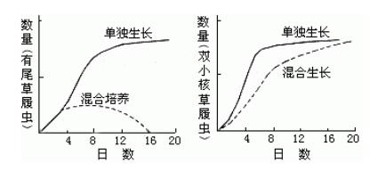 (2)比较2种草履虫单独生长的数量曲线图,可以发现,双小核草履虫比有尾草履虫世代时间略短,因而繁殖速度略快。由于双小核草履虫有这样一个优越性,在一定量食物的限制因素之下,它就能胜过有尾草履虫而生存下来。生物学上把这样两个物种之间为争夺生活资源而发生斗争的现象称为(种间)竞争。