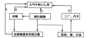 【解析】本题要考查学生有关碳循环过程的理解程度。读图可知,本图少了一个箭头,即从大气中CO2库到绿色植物的箭头,这是大气中的CO2通过自养生物进入生物群落的途径,如果没有这一途径,碳元素就不能在无机环境与生物群落之间返复循环;图中的字母A表示分解者的呼吸作用,分解者将有机物氧化分解,释放出能量,同时产生CO2,这一过程的本质是这些生物的呼吸作用,与图中的字母B和C是相同的;而图中字母D表示的是燃烧释放CO2的过程,不属于生物的呼吸作用;本题的最后两问主要考查生态系统中物质循环和能量流动的关系的。