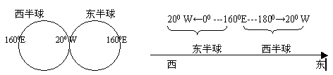 【解题思路】 解决该题的关键是分清东西半球的分界线。因为东西经度划分的界线与东西半球的界线不同。由于地球是圆的,东西半球的位置可以互为东西。见下图: