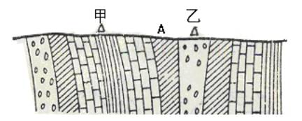 (1)根据岩层新老关系判断图中褶曲形态:甲地是 ,乙地是 ;(2)如果在图中A岩层发现煤层,在甲地钻孔,是否能挖到煤 ,原因是