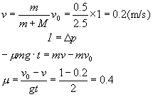 分析与解答: 由于水平面是光滑的,所以木块和小车构成的系统满足动量守恒定律,这样可以解得木块和小车共同的求速度,而小车动量的变化是由于摩擦力的冲量引起的,根据动量定理可以解得木块所受的摩擦力,可以求得动摩擦因数。
