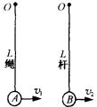 分析:线或杆对小球的弹力,在小球绕O点做圆周运动的过程中,始终与瞬时速度相垂直,所以弹力不做功.只有重力作功,小球的机械能守恒.要注意到线与杆对球约束的差异,线可受拉力不能受压力.所以A球达最高点线的拉力的最小值为零,线不可能给小球以支持力,球速不能小于