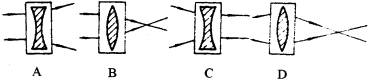 在图A中,入射光线是平行光束,经透镜折射后,主轴上方光线向上远离主轴偏折,主轴下方的光线向下远离,即折射光线发散,说明这个透镜有发散作用应为凹透镜.