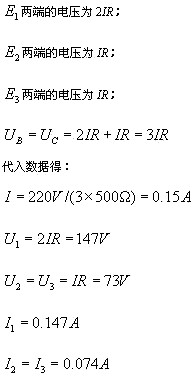 (2)如果A相断开,则意味着在BC之间接入两路串联的负载电灯,负载两段的电压为380V的线电压,电路的总电阻为500Ω×2=1000Ω,所以电流则为0.38A,而加载在每一组负载电灯上的电压为190V.