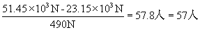 说明:这里采用去尾法,而不四舍五入, 是因为物理运算要符合实际,如果取57人,本筏与人重力之和小于木筏受到的最大浮力,人可以安全渡过,但如果取58人,人和木筏总重就大于木筏所受最大浮力,木筏下沉,不能安全渡河。