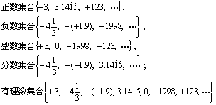 (2)正整数、正分数构成正数集合;负整数、负分数构成负数集合;正整数(自然数),0,负整数构成整数集合;正分数、负分数构成分数集合。