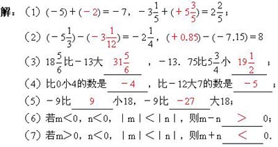说明:初学有理数计算的学生,因为受小学加减运算的习惯所影响,若把例1中各题两数之间的符号读作“加”、“减”,则非常容易出错误,所以建议把式中的“+”、“-”号一律读作“正”、“负”,按加法进行运算,经过一段时间的练习之后,再灵活掌握.