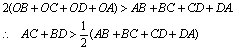 分析:两条对角线AC、BD将四边形ABCD分成了四个三角形△OAB、△OBC、△OCD、△ODA,在这四个三角形中分别利用两边之和大于第三边的定理即可得出需证的结论.