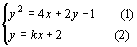 分析:方程组的解的情况取决于消元后一元二次方程的根的情况。因此应先消元,再根据一元二次方程根的判别式来确定k的取值。