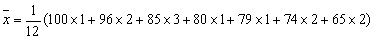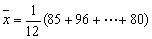 例4 某班第一小组有12人,一次数学测验成绩如下:85、96、74、100、96、85、79、65、74、85、65、80,试计算这12人的数学平均数。
