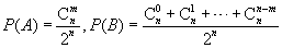说明:使用等可能事件概率公式时,首先要判定事件是不是等可能事件,本题实际上可推广到投掷几枚硬币,恰好有m枚正面向上的概率以及至少有m枚正面向上的概率,设两个事件分别为A、B,可以求到: