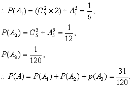 分析:至少有两封信与信封的标号配对,包含了下面两种类型:两封信与信封标号配对;3封信与信封标号配对;4封信与信封标号配对,注意:4封信配对与5封信配对是同一类型.现在我们把上述三种类型依次记为事件