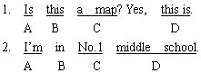 解析:拿到改错题,首先应对句子结构进行分析,看有无句子结构方面的错误,比如语序是否规范,成分是否完整,句意前后是否矛盾,大小写、缩写形式、标点符号用法是不是正确等等。例1错误在D处,this/that指物时,答语中常用it代替,故应将this is改为it is;例2错在D处,用于专有名词短语中,第一个大写字母应大写,middle school应改为Middle School。