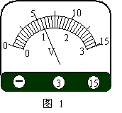 例题:如图1所示,当电压表使用“-,3”接线柱时,电压表的的最大测量值是_______伏,最小分度是_______伏,此时电压表的示数是________伏;当电压表使用“-,15”接线柱时,电压表的的最大测量值是_______伏,最小分度是_______伏,此时电压表的示数是________伏.