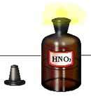 纯硝酸是无色、易挥发、有刺激性气味的液体。硝酸与水互溶,浓硝酸一般在14mol/L以上,稀硝酸一般在6mol/L以下。浓硝酸常带黄色,因为分解出的棕色NO2溶入酸内。硝酸开盖后又酸雾逸出,这是因为放出的硝酸蒸汽与空气里的水蒸气成了极微小的硝酸液滴,所以叫发烟硝酸。