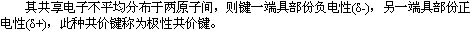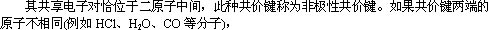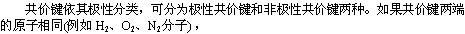 共价键的种类:共价键可依共享电子对数目、极性加以分类。共价键依其共享电子对数目,可分为单键、双键及参键。单键为两原子间共享一对电子,符号以“─”表示,例如H─H、F─F等。双键为两原子间共享两对电子,以“=”表示,例如O=O、O=C=O、H2C=CH2等。参键为两原子间共享三对电子,以“≡”表示,例如N≡N、C≡O、HC≡CH等。