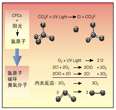 人类活动产生的微量气体,如氮氧化物和氟氯烃CFCs(chlorofluorocarbons)等,对大气中臭氧的含量有很大的影响。引起臭氧层被破坏的原因有多种解释,其中公认的原因之一是氟利昂的大量使用。氟利昂被广泛用作致冷剂、发泡剂、清洗剂、气喷雾剂等。氟利昂化学性质稳定,易挥发,不溶于水。但是进入大气平流层后,受紫外线辐射而分解产生Cl原子,Cl原子则可引发破坏