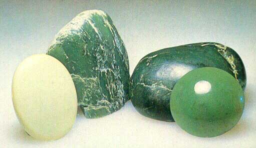 硬玉:与软玉通称为玉,成分为NaAl(SiO3)2,结晶或致密块状,有浓绿、淡绿或白色,绿色者常名翡翠,略透明,硬度为6.5~7,较软玉难溶解。软玉的成分为Ca(Mg,Fe)3(SiO3)4,硬度为5.5~6。