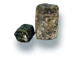 蛋白石: 含水二氧化硅,硬度逊于石英,表面常呈葡萄状,有白灰、黄褐等色,光泽似脂肪或珍珠,不透明至微透明。若为美丽乳房状,常呈红或绿色,光泽强,剖面能显各种美色之反光者,常称为贵蛋白石。