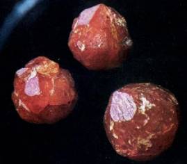 石榴石: 是一荧硅酸盐,成分不定,有以下式子:3RO·R2¢O3·3SO2,其中R代表钙、镁、铁或锰,又代表铝、铁、铬或钴,硬度为6.5~7.5,透明至微透明,时或光性异常,呈双折射现象,色译一般美丽。组成为Fe3Al2Si3O12者名为贵石榴石,常为血红或粉红,外观略带黑色。