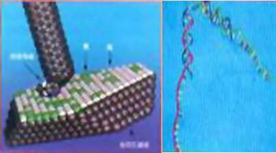 左图为纳米存储器,存储密度可达每平方厘米10万亿字节。右图是利用DNA自我组合原理进行设计的DNA开关,利用它将可以制造出分子大小的电子电路,使未来的计算机体积更小,运算速度更快