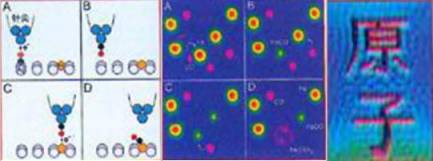左图是一个铁原子(Fe)与一人一氧化碳分子(CO)结合形成一个铁羰基(FeCO)分子的过程。先用扫描隧道显微镜针尖拾取一个铁原子(Fe)并将它移走,然后将CO放到Fe上面,两者结合形成FeCO分子。中图是用显微拍摄的该过程的照片,其中图C,图D显示的是继续利用一个CO和FeCO结合成Fe(CO)2分子的过程。用这种方法还可以用原子组成各种图形,如右图。