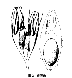 早期的种子植物十分罕见,至今,古植物学家还没能根据零星的化石材料恢复出一个完整的植株。人们现有的有关知识主要从研究晚泥盆世所发现的单独保存的种子状化石中获得。一般认为种子是着生大孢子的器官(大孢子囊等)经过一系列复杂的变化的结果。泥盆纪的化石纪录显示,随着时代的更新,某些孢子植物的大孢子囊内的孢子体积渐趋增大、数目减少,从16个到8个到4个,最终仅一个能育,其余3个败育。在晚泥盆世晚期所找到的若干含有单个大孢子的囊,其壁已不再开裂并且在顶部还发育出一个瓶口状的结构以接纳小孢子(花粉)。这样的大孢子囊已具备了种子(胚珠)的雏形。人们称之为前胚珠(图2)。它们与真正的种子(胚珠)的差别除了囊壁(珠心)的构造外,还在于包被(珠被)的有无和结构。它们的包被(珠被)发育不全,未能在顶部收聚形成一个管孔(珠孔),也有的甚至全然缺失包被。