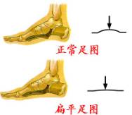 第二、由于内侧纵弓构造弯曲成弧形,稍高于地面,有如弹簧条或拉紧的弓相比拟,故使足来得特别具有弹性及灵活性。这样可使我们在运动中,当走、跑、跳跃和从高处向下跳时,可以减小地面对人体的反作用力,并且在它的弹性机械中被抵消了,或者完全不传到头部或者非常轻微的程度传到头都,避免了因剧烈震动而引起的痛苦或创伤及对人的器官产生不良的影响。相反的,如果我们人的足弓弓顶下塌,弓消失而成为扁平足(所谓平足症)(如下图)。