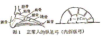 足是人体的支撑和运动器官。在我们正常人的足形不论是从侧面看和正面看都是不平坦的,而是有穹隆的,其凸隆朝足背。凹侧向足底面,这便是足弓(图1)。