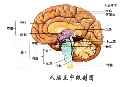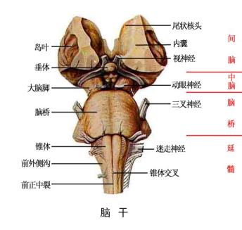 人脑的—部分,包括中脑、脑桥和延髓。上接间脑,下连脊髓,背面与小脑连接,并同位于颅后窝中。脑干的背侧与小脑之间有一空腔,为脊髓中央管的延伸,称第四脑室。脑干也由灰质和白质构成。脑干的灰质仅延髓下半部与脊髓相似,其他部位不形成连续的细胞柱,而是由机能相同的神经细胞集合成团块或短柱形神经核。神经核分两种,一种是与第3~12对脑神经相连的脑神经核;另一种是主要与传导束有关的神经核。如网状结构核团。脑干中有许多重要神经中枢,如心血管运动中枢、呼吸中枢、吞咽中枢,以及视、听和平衡等反射中枢。
