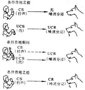 现在我们来看看经典条件作用的实验,他把狗用一副套具固定住,唾液是用联结在狗颚外侧的管道收集的,管道连结到一个既可以测量以立方厘米计的总量、也可以记录分泌的滴数的装置(如图2所示)。如前所述,当狗嘴里有食物时,会产生分泌唾液的反应。这种反应是本能固有的,巴甫洛夫把这种食物称为无条件刺激,简称“UCS”,把反射性唾液分泌称为无条件反射,简称“UCR”。为了使狗对某一种刺激(如铃声)形成条件作用,把这种原来只会引起探索性反射的中性刺激(即铃声)与无条件刺激(即肉)配对。经过一系列配对尝试后,单是发出铃声,不提供肉,也能引起狗产生唾液分泌。在这种情况下,铃声就成了条件刺激,简称“CS”,铃声引起的唾液分泌就是条件反射,简名“CR”(如图3所示)。由此可见,条件反射仅仅是由于条件刺激与无条件刺激配对呈现的结果。