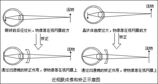 在无调节状态下,平行光线进入眼内,经屈光间质屈折后,在视网膜前形成焦点者称近视。形成的原因有:(1)眼的屈光力正常,而眼轴变长,因此平行光线进入眼内,必然在视网膜前聚焦成像,这叫轴性近视。一般认为眼轴延长1毫米,可增加3D屈光度。(2)眼轴在正常范围内,但屈光间质的屈光力过强。如角膜或晶体的弯曲度比正常人大,称屈光性近视。(3)由于晶体的屈光指数改变所致的为屈光指数性近视。临床上将-3D屈光度以下称轻度近视,-6D屈光度以下称中度近视,-6D屈光度以上称高度近视。少数高度近视眼发展较快,眼底出现病变,视力无法完全矫正,临床称为进行性或恶性近视。近视眼的裸眼视力差,但看近处依然十分清楚,这是因为近视眼视网膜反射出来的光线呈集会状态,在眼前有限距离形成运点,如近处目标恰好在远点范围内,不用调节就能在视网膜上形成清晰的物像。近视眼的病人如久不戴镜,由于过度使用调节和集合,容易引起视力疲劳,特别是高度近视眼。中度和高度近视眼有时眼前有黑影浮游,这与玻璃体液化、混浊有关。此外,高度近视眼常有眼球突出外观,还容易引起眼底病变,脉络膜萎缩斑、后巩膜葡萄肿、黄斑出血等,并易于发生视网膜裂孔和视网膜脱离。近视眼原则上应戴眼镜矫正,配镜前应首先验光。以获得较好的视力,使用最低的度数的镜片为原则。14岁以下青少年应散瞳验光。对于高度近视眼,可配接触镜矫正,以减少由于戴高度近视眼镜造成的使物像变小的影响。