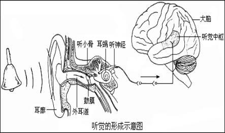 声音通过听觉系统的感受和分析引起的感觉。外界声波进入外耳道,引起鼓膜振动。鼓膜的振动频率与声波频率一致,振幅决定于声波强度。当鼓膜作内外方向振动时,通过三块听小骨的传递,使抵在前庭窗上的镫骨底板振动,引起内耳前庭阶外淋巴液振动。使前庭膜、蜗管内淋巴、基底膜、鼓阶外淋巴,以及圆窗膜相继发生振动。基底膜的振动使螺旋器的毛细胞与鼓膜相对位置不断变化,引起毛细胞发出神经冲动,使耳蜗神经纤维产生动作电位。传至延髓,再经中脑下丘到内侧膝状体,最后到大脑皮质的颞叶,形成听觉。声音频率的高低即为音调的高低,正常人能感受的范围为20~20000赫;声音的强度即为响度,人能感受的最弱的声音强度约为0.0002达因/厘米2,比它强100万倍的声音,人仍可耐受。人对声调频率和强度都有很高的辨别能力。听觉有适应及疲劳等生理现象。中耳鼓膜或听骨链损伤或障碍所引起的听力下降,称为传导性耳聋。内耳螺旋器、蜗神经和中枢神经出现病变,称神经性耳聋。正常情况下,声波主要通过空气传导,听骨链出现功能障碍的病人,也可通过发声物体直接与颅骨接触而使声波传到内耳,引起听觉。此法可用以鉴别传导性耳聋和神经性耳聋。