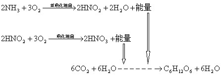 上面的前两个反应式是说明氨和亚硝酸的氧化和放出能量的过程;最后一个反应式是说明硝化细菌利用前面的两个反应式中所放出的能量,把从外界摄取的二氧化碳和水合成为葡萄糖的过程。