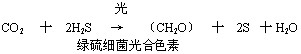 光合细菌和绿色值物都能够进行光合作用,但是,绿色植物的光合作用是以水作为二氧化碳的还原剂,同时释放出氧的,细菌光合作用则以硫化氢或有机物(如乙醇、琥珀酸等)为供氢体,即还原二氧化碳的还原剂,把二氧化碳还原为葡萄糖,同时析出硫磺或产生其它有机物(如乙醛等),下面写出的是绿硫细菌的光合作用反应式: