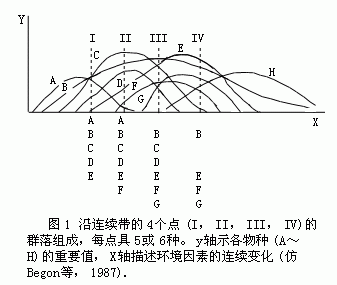 长期来,多数群落生态学家持机体论观点,如Clements、Tansley和Elton,所以绝大多数教科书把生物群落定义为一定生境中各生物种群相互作用而有机结合的结构单元。但持个体论学者从未中断争论,尤其是50年代以来,一些采用定量方法(如梯度分析和排序等)的研究证明,陆地群落并不是一个个分离的、有明显边界的实体,而是在空间和时间上连续的一个系列(图1)。即各物种在环境梯度上的分布彼此独立,而不是许多物种经常地结合在一起形成一个有机的物种群。大量排序研究结果都与此类似。这一事实使更多的生态学家倾向了个体论学派的观点,并占了上风。但机体论学派并不由此而停止争论,仍以各种变型和论点出现。还有一些学者认为没有一派的观点能包括全部真理,并提出已经到了停止争论的时刻了。