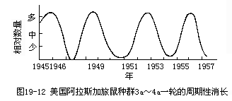 (1)食物 旅鼠(Lemmas)过多时,它们在草原大面积地吃草,草原植被遭到破坏,结果食物缺乏(加上其他因素,如生殖力降低,容易暴露给天敌等)。种群数量从而减少,但数量减少后,植被又逐渐恢复,旅鼠数量也随着恢复过来(图19-12)。