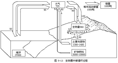 地球上碳的总量约为26×1015吨,绝大多数以无机形态存在于岩石圈中,大气中CO2约含碳7000亿吨,生物圈中碳的循环主要有三条途径:一是始于绿色植物并经陆生生物与大气之间的碳交换;第二条途径是海洋生物与大气间的碳交换;人类对化石燃料的应用是碳循环的第三条途径。生物圈中碳循环过程可简括为图5-13所示。