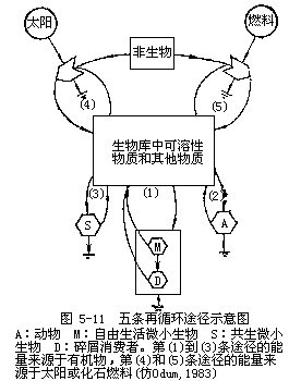 1.物质由动物排泄返回环境。包括海洋等以浮游生物为优势种的水域生态系统都可能以这种途径为主。据研究(Harris,1959),浮游动物在其生存期间所排出的无机物和有机可溶性营养物质的数量,比它们死亡后经微生物分解所放出的数量要多好几倍,而且排泄的可溶性营养物能直接被生产者所利用。