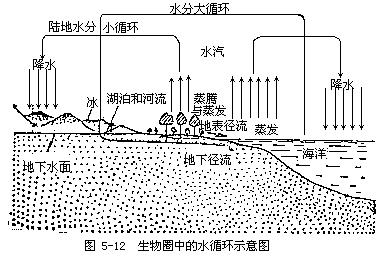 海洋和陆地上分布的水,由于太阳辐射作用,一部分蒸发为大气中的水汽,但陆地和海洋的蒸发量不相等。假如地球上的总降水量为100单位,那么,来源于海洋的蒸发量占84单位,来源陆地的只有16单位。但100单位的降水量中,海洋得77单位,陆地为23单位,海洋亏缺部分是由陆地入海的水而得到补偿。生物圈中水的循环过程见图5-12。