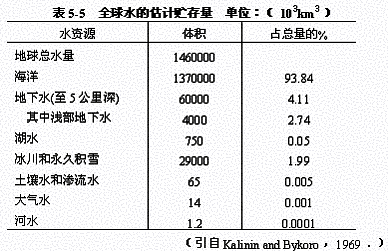 1.水循环:属液相循环,是在太阳能驱动下,水从一种形式转变为另一种形式,并在气流(风)和海流的推动下在生物圈内的循环。水在生物圈中的形式分为气态、液态和固态。各种形式水的数量及在地球上的分布见表5-5。