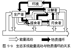生态系统中生命成分的生存和繁衍,除需要能量外,还必须从环境中得到生命活动所需要的各种营养物质。没有外界物质的输入,生命就停止,生态系统也将随之解体。物质还是能量的载体,没有物质,能量就会自由散失,也就不可能沿着食物链传递。所以,物质既是维持生命活动的结构基础,也是贮存化学能的运载工具。生态系统的能量流和物质流紧密联系,共同进行,维持着生态系统的生长发育和进化演替。两者的关系见图5-9。