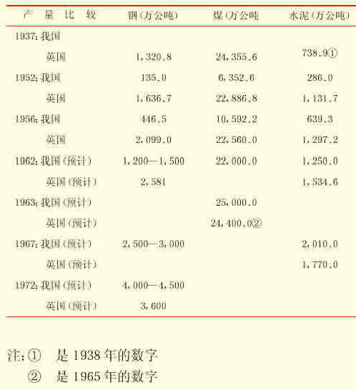 关于煤的产量:一九五六年我国产煤10,592万吨,英国为22,560万吨。我国不及英国一半,但是这时期我国的速度每年增产14﹪,以后能一直保持这样的速度。而英国四 十几年来煤的生产呈下降趋势。因此,在一九六三年就能超过英国一九六五年的生产量。
