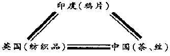 英国资产阶级把本国生产的纺织品倾销到印度,把印度生产的鸦片购进转卖到中国,再把中国的生丝和茶叶购进来销往本土和世界各地。其中鸦片是关键环节。鸦片贸易扩得越大,"三角贸易"的链条就会转得越快,英国资产阶级获得的利润也就越多。
