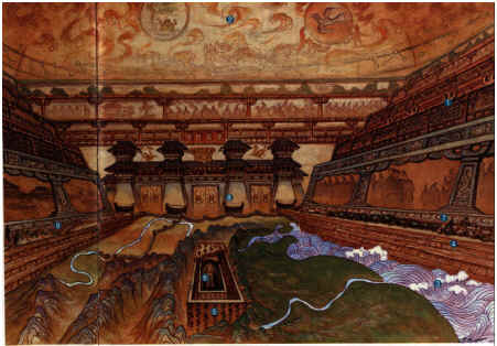 ⑦秦始皇的随葬品丰富,由六国掠夺的奇珍异宝堆满墓室。在墓室两侧设有专门放置随葬品的地方,这里也是主人宴乐活动之处。