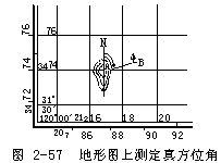 真方位角,系从过某点P的真子午线北端起,顺时针方向到某目标M方向线之间的水平夹角(A)。在地形图上欲求AB线段的真方位角,可以从A点作上述真子午线的平行线AN,用量角器以AN为起始边,顺时针量至AB方向线的夹角,即得AB线段的真方位角(图2-57)。