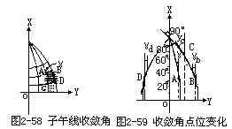 在高斯-克吕格投影带中,除了中央经线外,所有经线都投影成向两极收敛的弧线,因而在高斯平面直角坐标系中,除了该坐标系的纵轴(中央经线)与真子午线重合外,其它坐标纵线由于与真子午线不平行而构成一个夹角,故称之子午线收敛角(图2-58)。在每个投影带内各点的子午线收敛角不一定相等,在中央经线和赤道线上各点的子午线收敛角为零,离中央经线越远或纬度越高,则子午线收敛的绝对值就越大,到极点处等于经差,在6°投影带的最大偏角为±3°(图2-59)。