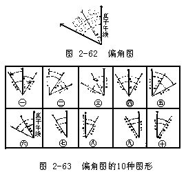 偏角图,系由三北方向线及相应的偏角构成的图形(图2-62)。根据三北方向线相互关系的10种情况,可以绘出10种图形(图2-63),常见的为前6种,绘置于≥1∶10万地形图南图廓的外侧。此图形只表示相互关系,其张角大小不反映真实的角值,在偏角图上需注明角值(图2-62)。