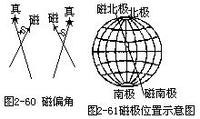 磁偏角,系过某点的磁子午线对真子午线的夹角(δ)。以真子午线为准,磁子午线东偏为正,西偏为负(图2-60)。