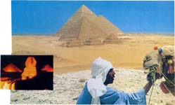 埃及的国土除了地中海沿岸外,几乎全是不降雨的沙漠气候。位于开罗市西基刹区的金字塔及狮身人面像有世界七大奇景之称。金字塔的建造年代遥远,经历漫长岁月依然巍峨耸立,建造时曾用民夫十万,重二吨至十六吨的巨石二百三十万块,才建成这座七夺天宫的金字塔,游客亦可进入金字塔,探索古墓的奥秘,亲身体验法老 王墓中的奢华设计。但有一点要注意的就是虽然金字塔的设计是可让外面的空气不断通过洞穴进入室内,但自处塔内仍是闷热难当,甚至令人有窒息之感。参观完金字塔,游客可骑骆驼漫游散哈拉沙漠,并前往位于金字塔旁,有四千年历史之狮身面像,此像经历了埃及的兴盛和衰落,默默守护着法老王的陵墓,随着时间的洗礼,使狮身人面像更显得残缺沧桑。开罗市内的埃及博物馆,馆内收藏着古埃及历代法老王的陪葬品,纯金的宫廷御用珍品,木乃伊,有三千年之久的面包,大量的黄金和宝石,其中重达二百四十二磅的金棺和独一无二的金面罩,更是不可多得的珍贵物品。